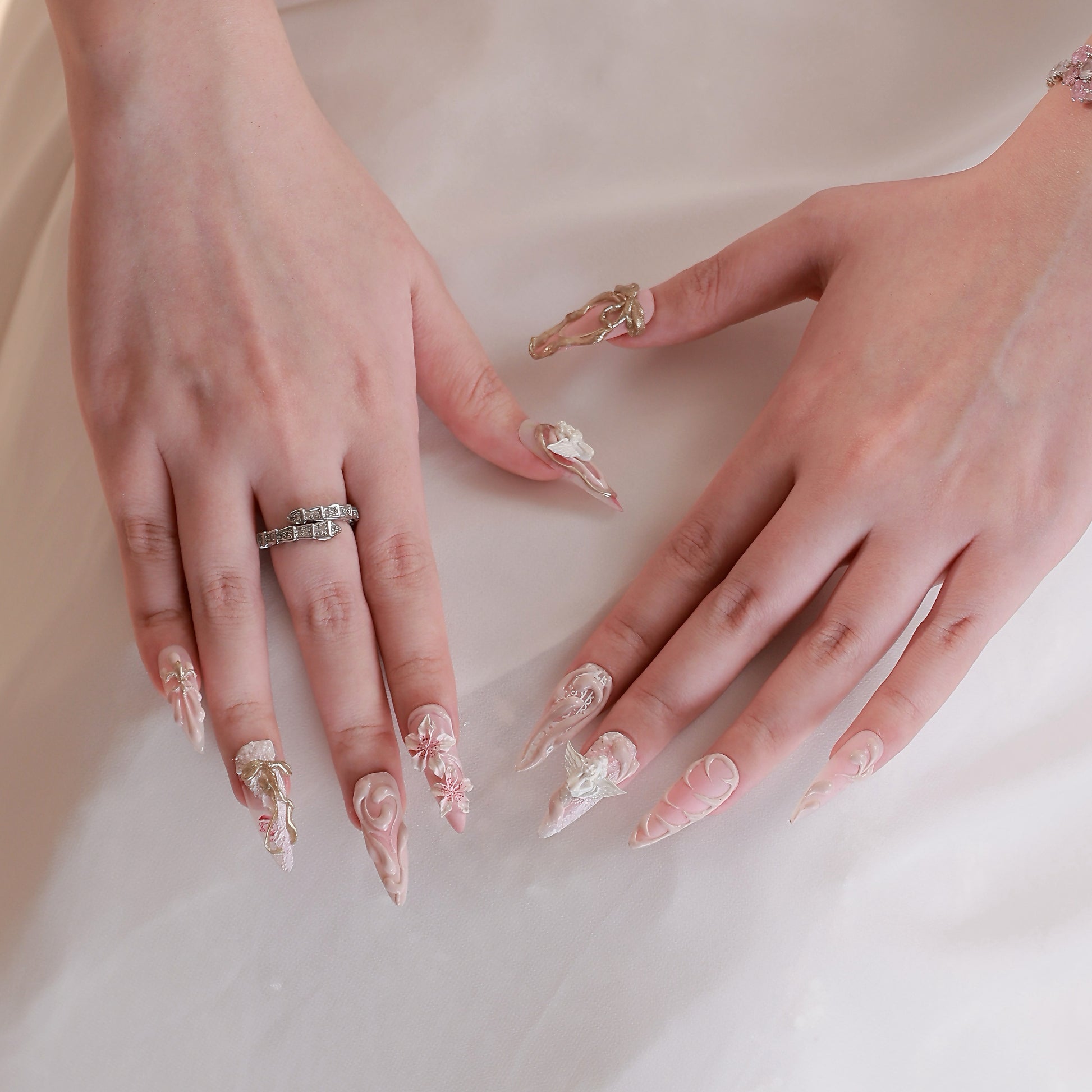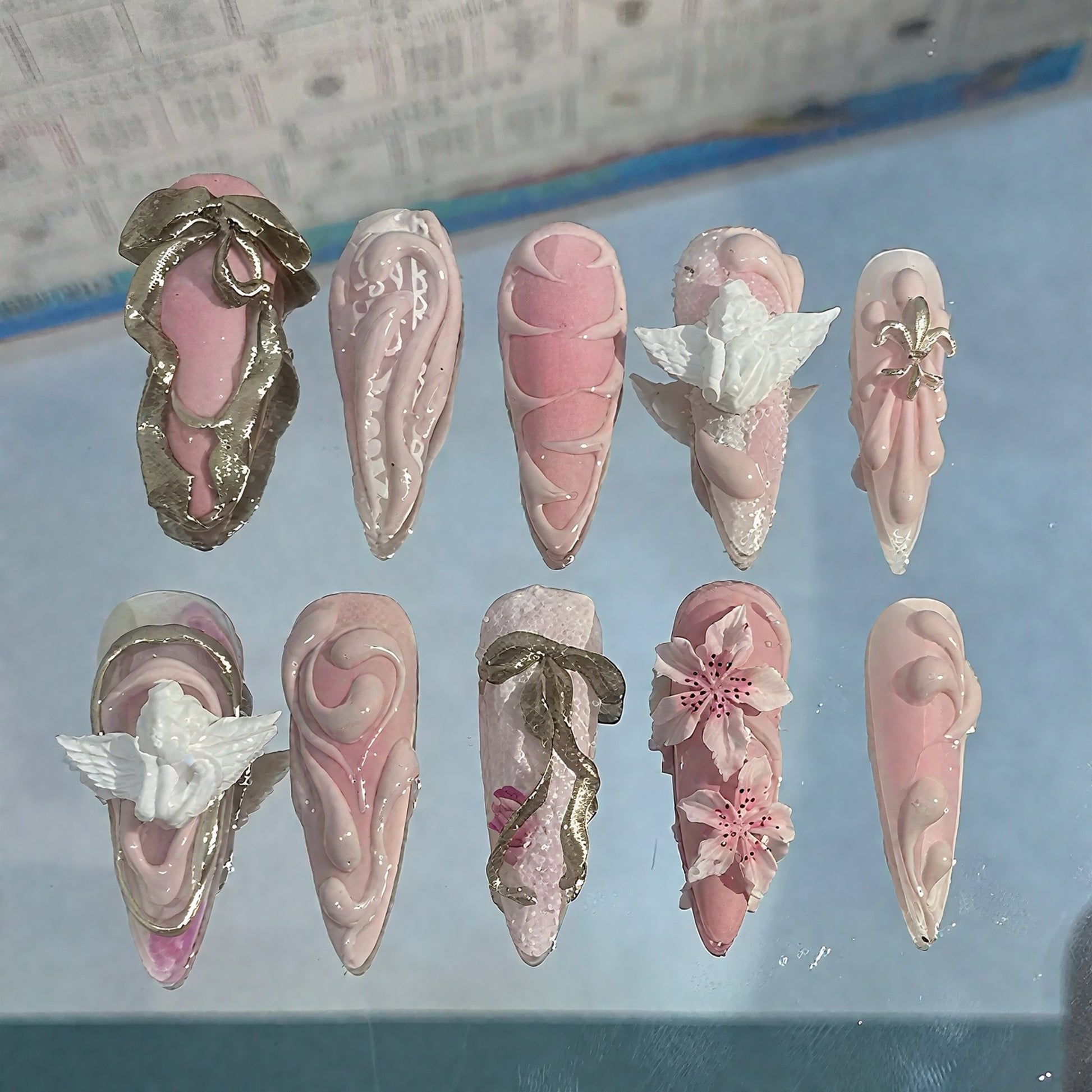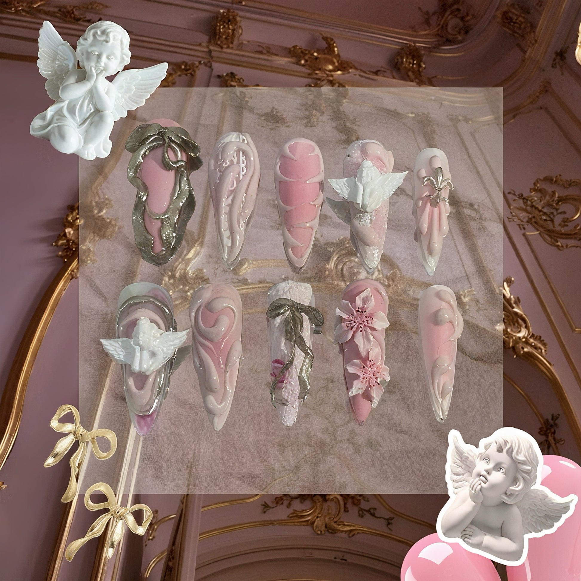 This set is very detailed and high-effort, with 3D sculpted elements (angels, ribbons, flowers), layered gel textures, and hand-crafted details.